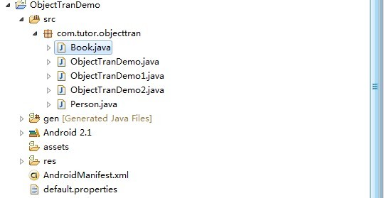 第一步:新建一个Android工程命名为ObjectTranDemo(类比较多哦!)目录结构如下图: