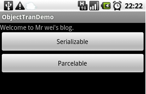 <?xml version="1.0" encoding="utf-8"?> <LinearLayout xmlns:android="http://schemas.android.com/apk/res/android" android:orientation="vertical" android:layout_width="fill_parent" android:layout_height="fill_parent" > <TextView android:layout_width="fill_parent" android:layout_height="wrap_content" android:text="Welcome to Mr wei's blog." /> <Button android:id="@+id/button1" android:layout_width="fill_parent" android:layout_height="wrap_content" android:text="Serializable" /> <Button android:id="@+id/button2" android:layout_width="fill_parent" android:layout_height="wrap_content" android:text="Parcelable" /> </LinearLayout>