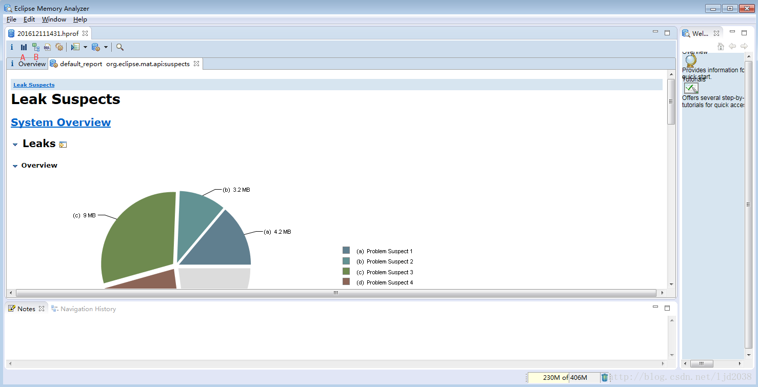 这时候可以通过MAT工具来打开导出的hprof文件。打开界面如下图所示: