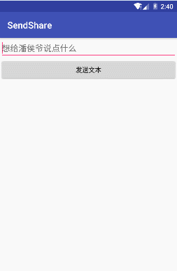 <?xml version="1.0" encoding="utf-8"?> <LinearLayout xmlns:android="http://schemas.android.com/apk/res/android" xmlns:tools="http://schemas.android.com/tools" android:id="@+id/activity_main" android:layout_width="match_parent" android:layout_height="match_parent" android:orientation="vertical" tools:context="com.example.administrator.sendshare.MainActivity"> <EditText android:id="@+id/et" android:layout_width="match_parent" android:layout_height="wrap_content" android:hint="想给潘侯爷说点什么"/> <Button android:layout_width="match_parent" android:layout_height="wrap_content" android:onClick="sendtext" android:text="发送文本" /> </LinearLayout>