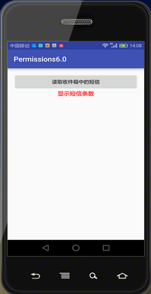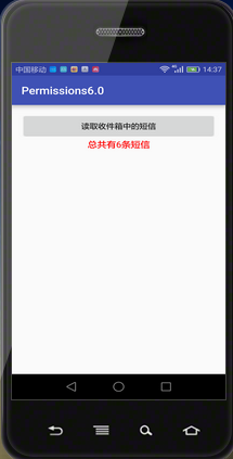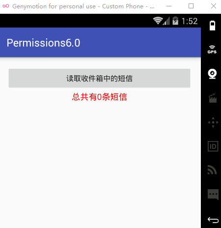 我们可以看到,当我们第一次点击读取短信时,它会先检查该应用是否有权限,如果没有,就去申请,这里在界面上对应的就是显示一个授权的对话框,第一次我们选择了拒绝授权,然后在回调里面就会对应先打印了我们的一个toast消失提醒我们拒绝了授权,但是当我们再次需要读取短信时,它还会去申请授权,这时我们允许授权,然后我们就看到了,在显示短信条数的TextView显示了短信的条数。(这里0条是因为的用的模拟器没有短信,这不是重点。)