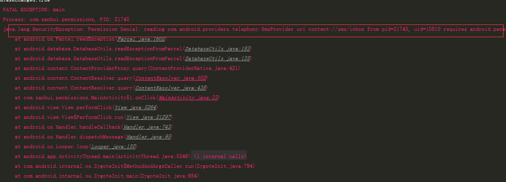 日志中很清晰的告诉我们,这个异常是因为没有权限而造成的,那么我们就直接给它加上读取短信的权限来看看吧。