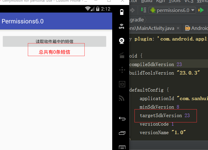 也是可以的,0条信息是因为我的模拟机上没短信,这个数字多少和我们没有关系。假如targetSdkVersion 为23呢,来看看结果: