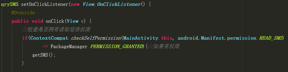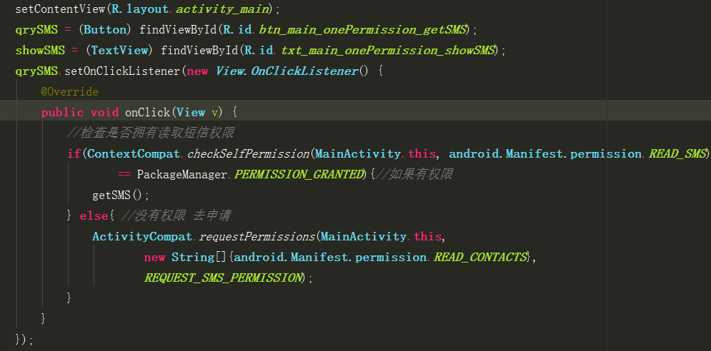 然后在方法内判断用户是授权了该权限组还是拒绝授权,如果授权则就去获取短信信息,否则,在这里我只是显示了一个toast提示框。