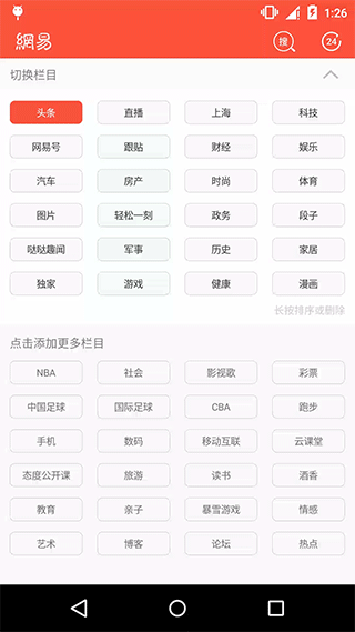 以上所述是小编给大家介绍的Android 仿网易新闻客户端分类排序功能,希望对大家有所帮助,如果大家有任何疑问请给我留言,小编会及时回复大家的。在此也非常感谢大家对脚本之家网站的支持!