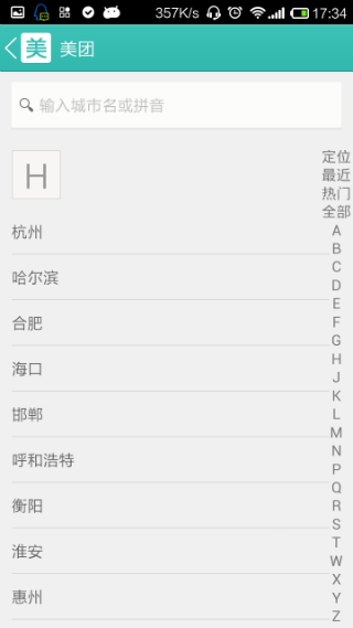 一、效果:我们看到很多软件的通讯录在右侧都有一个字母索引功能,像微信,小米通讯录,QQ,还有美团选择地区等等。这里我截了一张美团选择城市的图片来看看;