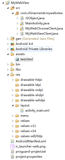 一、首先为大家介绍的是JS与Android交互,首先让大家看一下Android工程的目录结构: