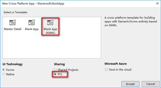 这里选择基于XAML的App,注意共享库使用PCL。