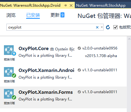 然后为Warensoft.StockApp.Droid添加OxyPlot的NuGet引用,如下所示:
