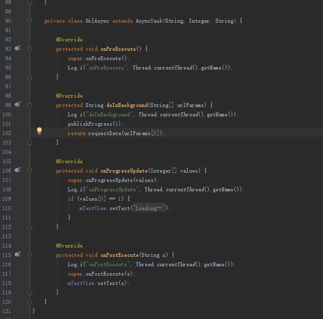 在创建AsyncTask的子类时,必须给出这三个具体的类型值,尖括号是泛型的意思。我不太理解API文档的解释,但往下看