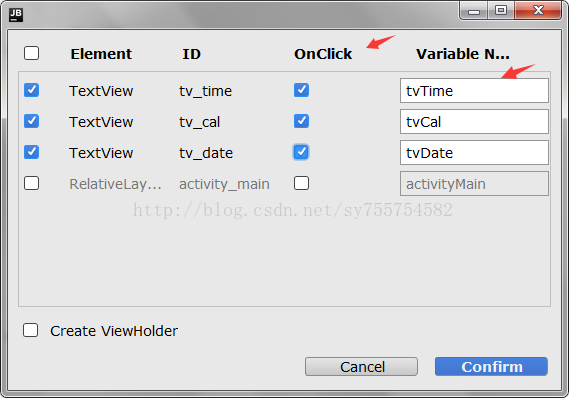 选中的有TextView点击事件和findViewById的注解,点击Confirm就成功了!