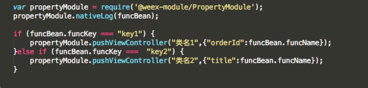 整体的思路是:原生给weex 提供一个通用的跳转方法。参数是类名和属性字典。