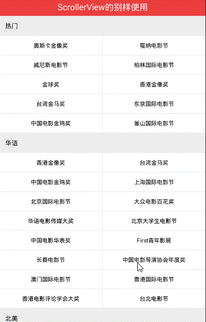 下面我单单从效果展示方面考虑,使用ScrollerView实现如下图所示的可滚动的多条目分类,只是为了跟大家一起分享一下新思路。(平时:若从复用性等方面考虑,这显然是存在瑕疵的~)