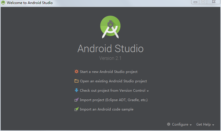 连续点击"Finish",结束在Eclipse中的操作。进入Android Studio,同样的关闭当前项目,进入Welcome对话框: