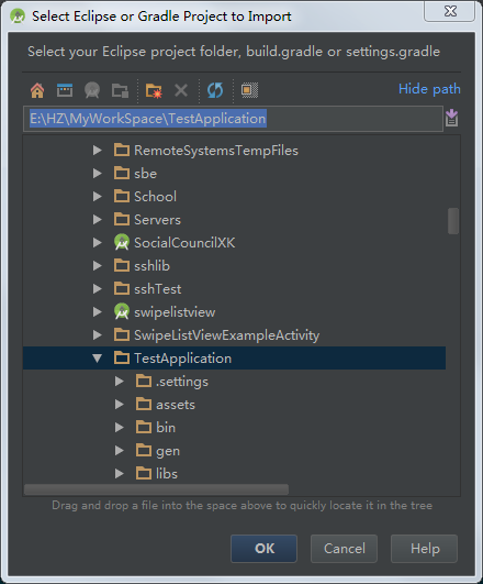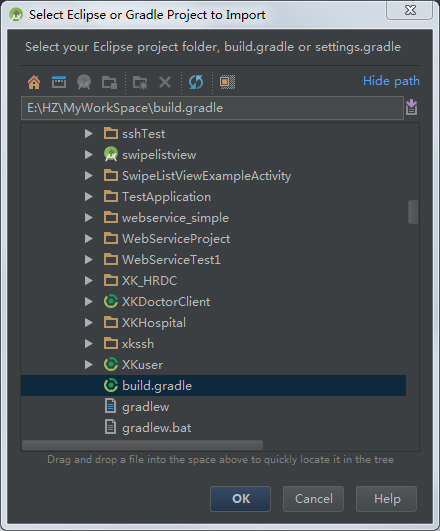 选择Import project (Eclipse ADT, Gradle, etc.),进入项目选择的对话框,注意这时就不是选择要导入的项目,而是Eclipse工作目录下的build.gradle文件: