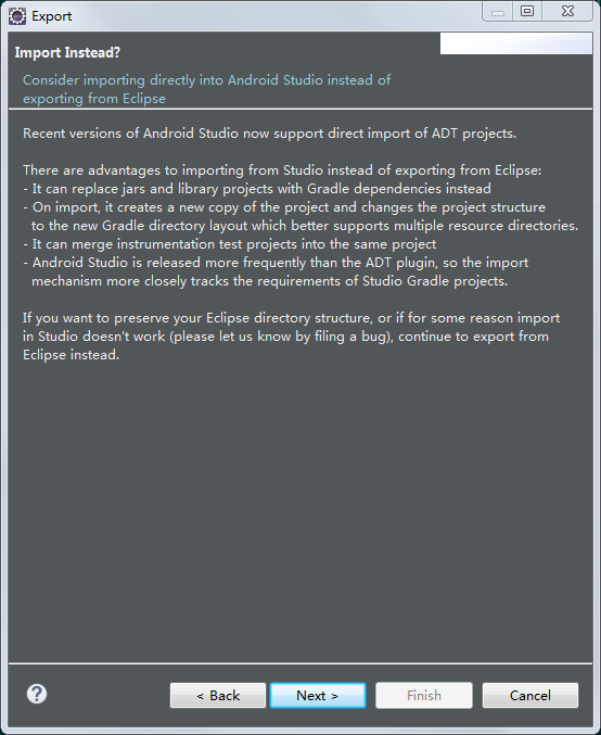 Android Studio导入Eclipse项目有两种方法,一种是直接把Eclipse项目导入Android Studio,另一种是在Eclipse项目里面进行转换,然后再导入Android Studio。