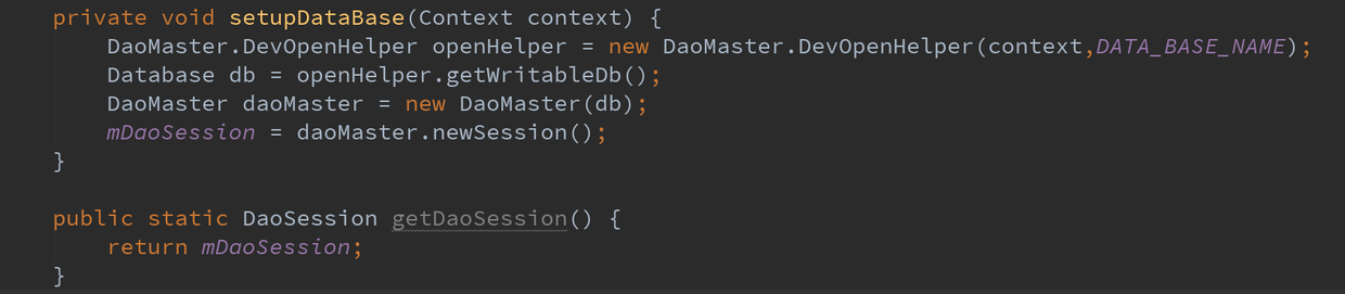 context上下文这个不用多说,name数据库的名字,cursorFactory游标工厂,一般不用,传入null或者使用两个参数的方法即可。我们对外提供一个getDaoSession()的方法供外部使用。