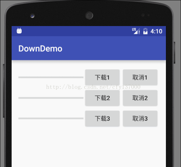 3个ProgressBar就是为了显示进度的,每个ProgressBar对应2个Button,一个是开始下载,一个是暂停(取消)下载,这里需要说明的是,对下载来说暂停和取消没有什么区别,除非当取消的时候,会顺带把临时文件都删除了,在本例里是不区分他俩的.