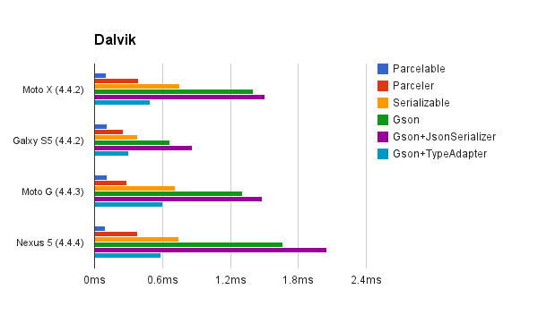 可以看出,通过转换为字符串的速度是最慢的。Seralizable次之,Parcelable比Seralizable快10倍。所以从性能上考 虑,我们必定优先选择Parcelable。但是Parcelable有大量重复的模板代码,如何简化这些操作,将是下面主要讲解的内容。