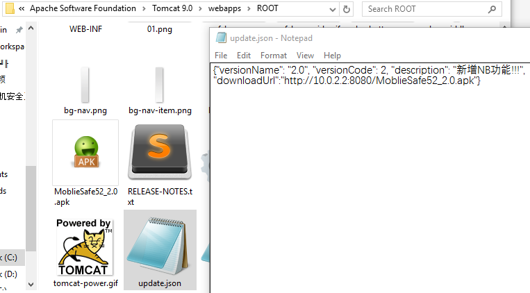 我们服务器用的是tomcat,里面放置 新版本的apk和update.json: