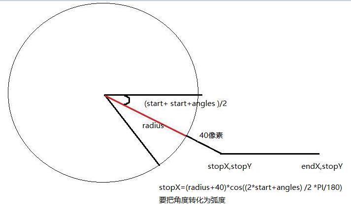 stopX = (float) ((radius + 40) * Math.cos((2 * start + angles) / 2 * Math.PI / 180));