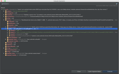 通过断点查看 Intent 的数据结构,发现 Intent 中的 mMap 成员变量含有一个 Uri,格式如下:content://com.android.chrome.FileProvider/BlockedFile_33215122012582,一眼看去就猜测这个 Uri 是 Chrome 通过 ContentProvider 供其他程序调用的,虽然与一开始猜测有已 .jpg 和 .png 结尾的数据不太一致,但好歹是有所发现。