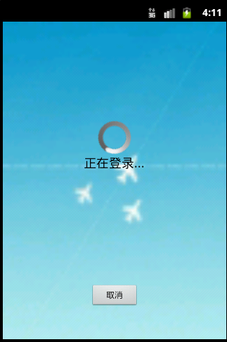 <?xml version="1.0" encoding="utf-8"?> <LinearLayout xmlns:android="http://schemas.android.com/apk/res/android" android:layout_width="fill_parent" android:layout_height="fill_parent" android:background="@drawable/logo_bg" android:orientation="vertical" > <RelativeLayout android:layout_width="fill_parent" android:layout_height="wrap_content" android:layout_weight="3"> <ProgressBar android:id="@+id/pgBar" android:layout_width="wrap_content" android:layout_height="wrap_content" android:layout_centerInParent="true" /> <TextView android:id="@+id/tv1" android:layout_width="wrap_content" android:layout_height="wrap_content" android:layout_below="@id/pgBar" android:layout_centerHorizontal="true" android:text="正在登录..." android:textColor="#000000" android:textSize="18sp" /> </RelativeLayout> <LinearLayout android:layout_width="fill_parent" android:layout_height="wrap_content" android:layout_weight="1" android:gravity="center" android:orientation="vertical" > <Button android:id="@+id/btn_back" android:layout_width="70dip" android:layout_height="35dip" android:text="取消" android:textColor="#000000" android:textSize="12sp" /> </LinearLayout> </LinearLayout>
