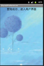 <?xml version="1.0" encoding="utf-8"?> <LinearLayout xmlns:android="http://schemas.android.com/apk/res/android" android:layout_width="fill_parent" android:layout_height="fill_parent" android:layout_gravity="center" android:background="@drawable/login_bg" android:orientation="vertical" > <TextView android:layout_width="fill_parent" android:layout_height="wrap_content" android:gravity="center" android:text="登陆成功,进入用户界面" android:textColor="#000000" android:textSize="20sp" /> </LinearLayout>
