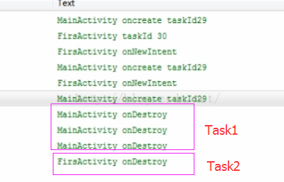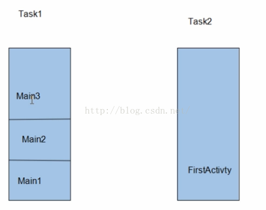 当点击返回键时,Activity的释放顺序如下:先时释放掉Task1中的三个MainActivity,然后再释放Task2中的FirstActivity。