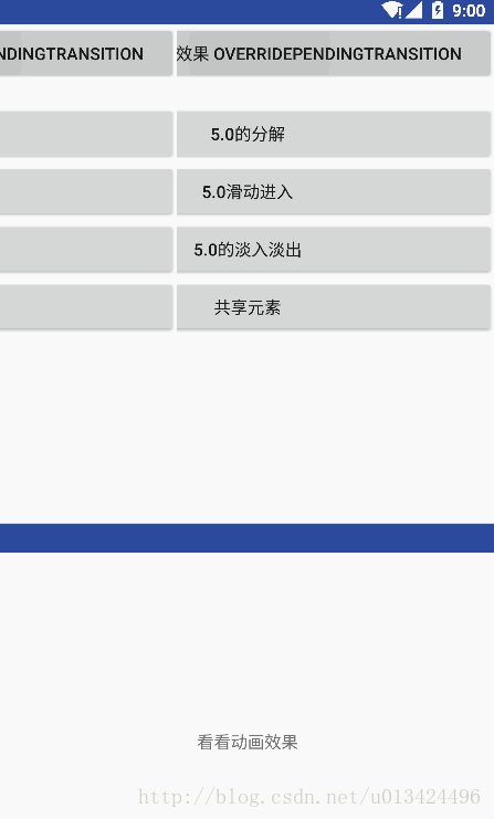 相对与之前的效果,5.0做了一个很大的改变,首先我们不用写xml文件了,系统直接封装好了,我们只要调用就好了,当然,由于动画没有对5.0之前做兼容,所以我们在5.0之前的手机还是要做下兼容,当然这是后话了。首先我们来看下5.0的效果