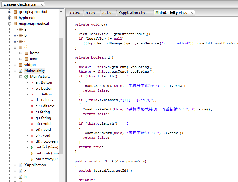 之后用该工具打开之前生成的classes_dex2jar.jar文件,便可以看到源码了,效果如下: 命名变成了a,b,c,d等等说明成功