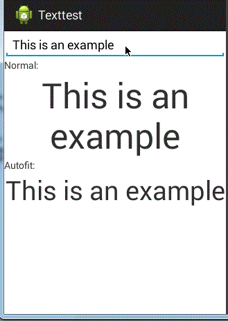 <?xml version="1.0" encoding="utf-8"?> <ScrollView xmlns:android="http://schemas.android.com/apk/res/android" xmlns:autofit="http://schemas.android.com/apk/res-auto" android:layout_width="match_parent" android:layout_height="match_parent"> <LinearLayout android:layout_width="match_parent" android:layout_height="wrap_content" android:orientation="vertical" > <EditText android:id="@+id/input" android:layout_width="match_parent" android:layout_height="wrap_content" android:singleLine="true" android:hint="@string/input_hint" android:text="@string/example"/> <TextView android:layout_width="match_parent" android:layout_height="wrap_content" android:text="@string/label_normal" /> <TextView android:id="@+id/output" android:layout_width="match_parent" android:layout_height="wrap_content" android:text="@string/example" android:textSize="50sp" android:gravity="center" /> <TextView android:layout_width="match_parent" android:layout_height="wrap_content" android:text="@string/label_autofit" /> <me.grantland.widget.AutofitTextView android:id="@+id/output_autofit" android:layout_width="match_parent" android:layout_height="wrap_content" android:text="@string/example" android:textSize="50sp" android:gravity="center" android:singleLine="true" autofit:minTextSize="8sp" /> </LinearLayout> </ScrollView> activity_main.xml