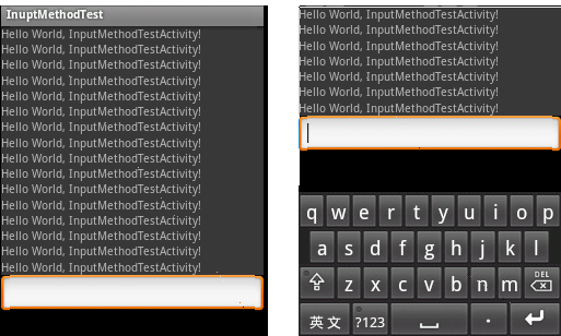 <com.winuxxan.inputMethodTest.ResizeLayout xmlns:android="http://schemas.android.com/apk/res/android" android:id="@+id/root_layout" android:layout_width="fill_parent" android:layout_height="fill_parent" android:orientation="vertical" > <EditText android:layout_width="fill_parent" android:layout_height="wrap_content" /> <LinearLayout android:id="@+id/bottom_layout" android:layout_width="fill_parent" android:layout_height="fill_parent" android:orientation="vertical" android:gravity="bottom">s <TextView android:layout_width="fill_parent" android:layout_height="wrap_content" android:text="@string/hello" android:background="#77777777" /> </LinearLayout> </com.winuxxan.inputMethodTest.ResizeLayout>