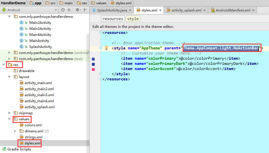 闪屏页面一般都为全屏显示,这里我们首先需要去除actionBar,在res/values/styles.xml中设置: