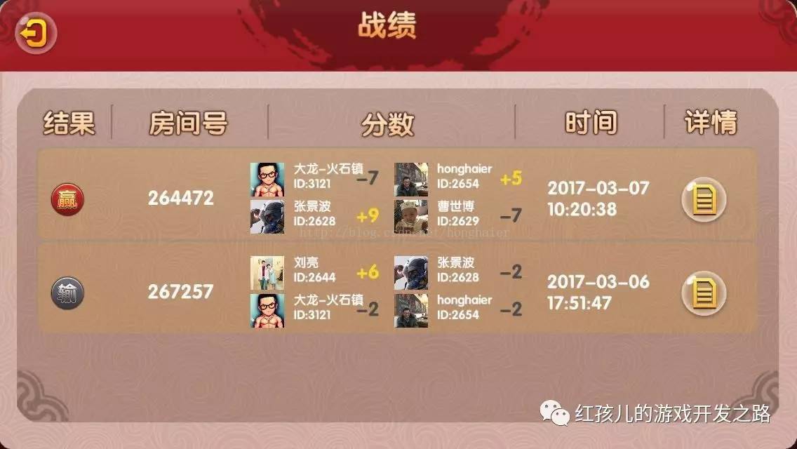 当玩家看到这条信息后,如果想查看每一局的战局,会再点击"详情"按钮,这时客户端会向登录服务器再次发送SUB_GP_GAME_RECORD_CHILD消息,同上面的流程大体一致,经过这样一个来回,客户端会得到房间中每局的详细数据,收到后通过StreamValue将数据流解析到结构tagPrivateRandRecordChild中显示出来。