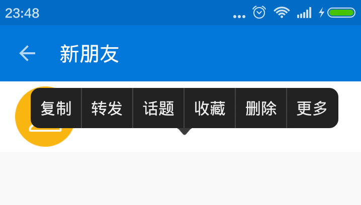 对于列表来说,如果想操作某个列表项,一般会采用长按弹出菜单的形式,默认的上下文菜单比较难看,而QQ的上下文菜单就人性化多了,整个菜单给用户一种气泡弹出的感觉,而且会显示在手指按下的位置,而技术实现我之前是使用popupWindow和RecyclerView实现的,上面一个RecyclerView,下面一个小箭头ImageView,但后来发现没有必要,而且可定制化也不高,还是使用多个TextView更好一点。