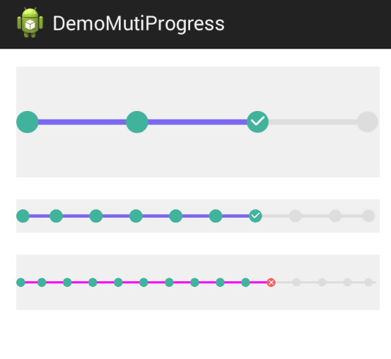 <RelativeLayout xmlns:android="http://schemas.android.com/apk/res/android" android:id="@+id/rl_parent" xmlns:tools="http://schemas.android.com/tools" android:layout_width="match_parent" android:layout_height="match_parent" android:paddingBottom="@dimen/activity_vertical_margin" android:paddingLeft="@dimen/activity_horizontal_margin" android:paddingRight="@dimen/activity_horizontal_margin" android:paddingTop="@dimen/activity_vertical_margin" android:background="#ffffff" tools:context=".MainActivity" xmlns:app="http://schemas.android.com/apk/res/com.demo.demomutiprogress"> <com.demo.demomutiprogress.MutiProgress android:id="@+id/mp_1" android:layout_width="match_parent" android:layout_height="100dp" app:nodesNum="4" app:currNodeState="1" app:currNodeNO="2" app:nodeRadius="10dp" app:processingLineColor="#7B68EE" app:unprogressingDrawable="@drawable/ic_round_ddd" app:progressingDrawable="@drawable/ic_completed" app:progresFailDrawable="@drawable/ic_error" app:progresSuccDrawable="@drawable/ic_checked"/> <com.demo.demomutiprogress.MutiProgress android:id="@+id/mp_2" android:layout_below="@+id/mp_1" android:layout_marginTop="20dp" android:layout_width="match_parent" android:layout_height="30dp" app:nodesNum="10" app:currNodeState="1" app:currNodeNO="6" app:nodeRadius="6dp" app:processingLineColor="#7B68EE" app:progressingDrawable="@drawable/ic_completed" app:unprogressingDrawable="@drawable/ic_round_ddd" app:progresFailDrawable="@drawable/ic_error" app:progresSuccDrawable="@drawable/ic_checked"/> <com.demo.demomutiprogress.MutiProgress android:id="@+id/mp_3" android:layout_below="@+id/mp_2" android:layout_marginTop="20dp" android:layout_width="match_parent" android:layout_height="50dp" app:nodesNum="15" app:currNodeState="0" app:currNodeNO="10" app:nodeRadius="4dp" app:processingLineColor="#FF00FF" app:progressingDrawable="@drawable/ic_completed" app:unprogressingDrawable="@drawable/ic_round_ddd" app:progresFailDrawable="@drawable/ic_error" app:progresSuccDrawable="@drawable/ic_checked"/> </RelativeLayout>