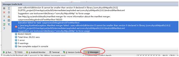 > java.lang.RuntimeException: Manifest merger failed : uses-sdk:minSdkVersion 8 cannot be smaller than version 9 declared in library [com.zhy:okhttputils:2.6.1] D:\RTDL_project\DriverApp\ua\build\intermediates\exploded-aar\com.zhy\okhttputils\2.6.1\AndroidManifest.xml