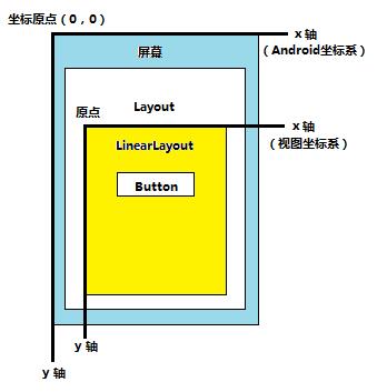 如上图中,对于Button来说,父视图LinearLayout左上角就是视图坐标系的原点(0,0)