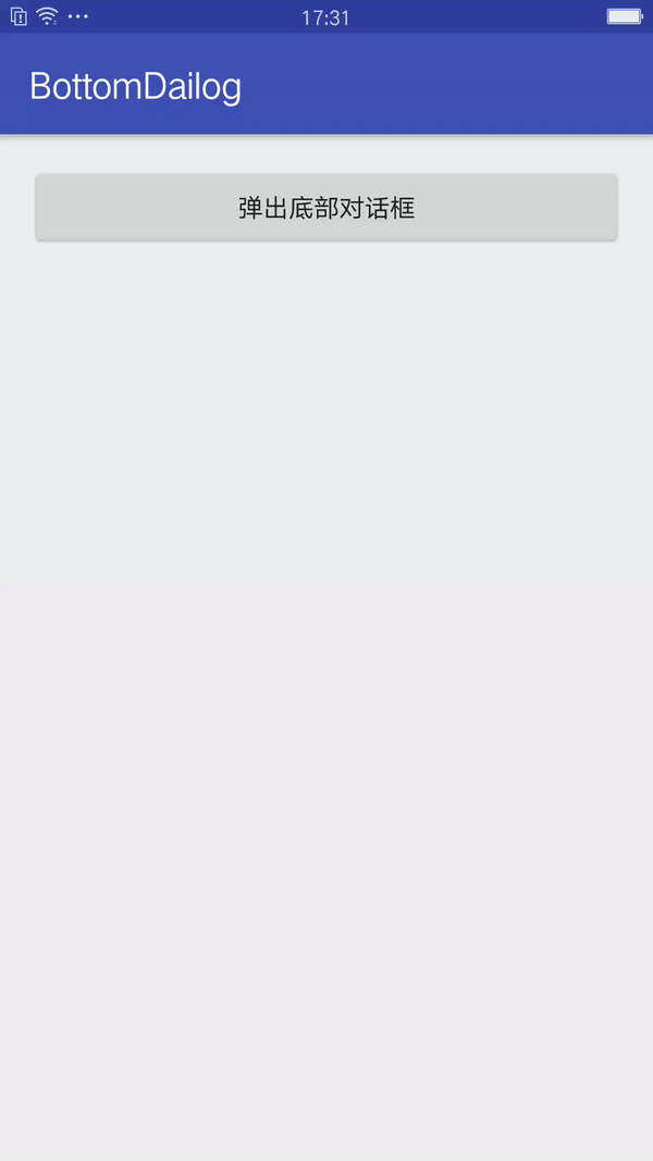 最近项目上需要实现一个底部对话框,要实现这样的功能其实很简单,先看代码: