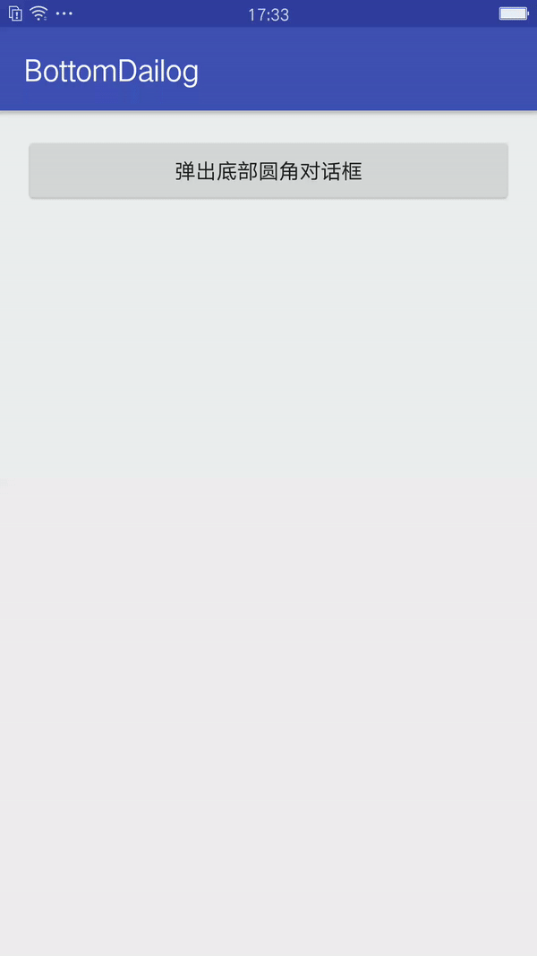 如果是要实现底部圆角对话框,原理也相似,只需要给contentView添加一个圆角的背景shape,并减小contentView的宽度给左右两边留一定的距离,同时给底部设置边距。