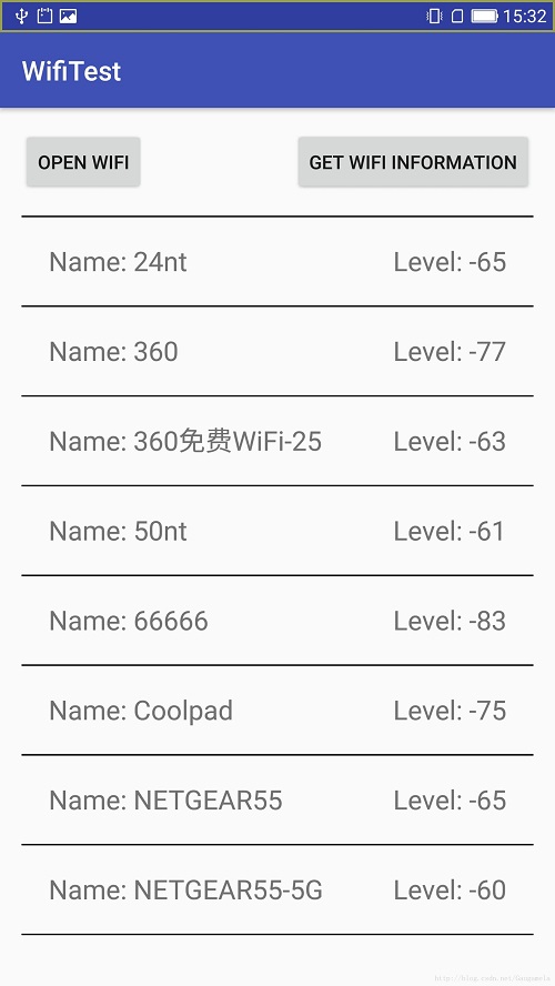 当获取到接入点信息后,我选取了其中的名称及信号强度,以列表的形式显示在主界面下方,如下图: