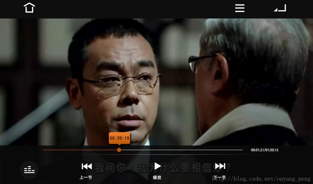 接下来说一说我的思路,上面的进度拖动条有自定义的Thumb,在Thumb正上方有一个PopupWindow窗口,窗口里面显示当前的播放时间。在SeekBar右边有一个文本框显示当前播放时间/总时间。