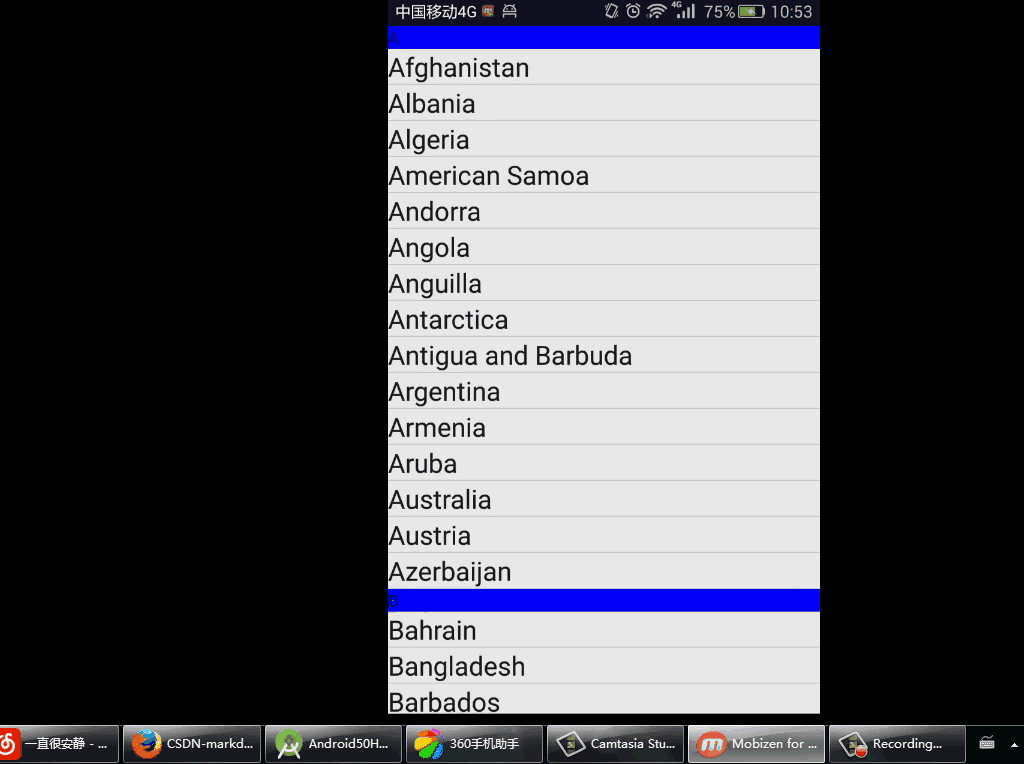 if (position == 0//检查列表项起始字母是否发生了改变,如果发生改变,该列表项就是分段中的第一项,修改分段标头的内容并显示该分段标头,否则隐藏