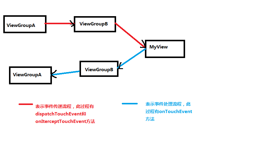 为处理成功,因此也不会再返回给ViewGroupA的onTouchEvent来处理了。此时MyView压根就不知道有个触摸事件在它的上层传递呢!所以在打印结果中,我们连MyView的影子