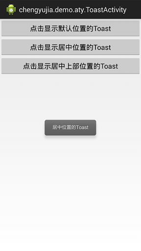 Android中Toast的默认位置在屏幕靠近底部的位置,这个默认位置有时候并不合适。比如页面上内容较少时,内容一般集中在屏幕上半部分,用户的注意力也集中在屏幕上半部分,默认位置的Toast用户可能没有注意到。还有可能是默认位置的Toast被用户的手挡住了。实践中感觉将Toast显示在屏幕的中部或中上部会比较好。如何修改Toast的默认位置呢?下面做一个简单的例子来演示一下。