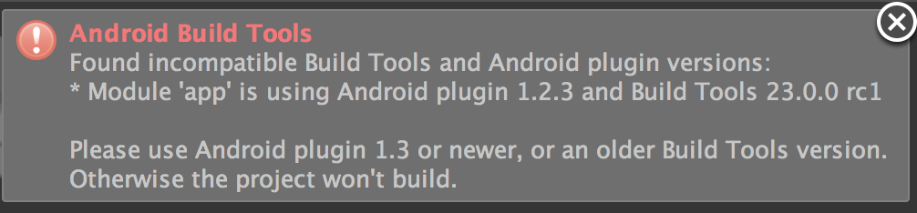 如果 Module 用到的 buildToolsVersion 高于 22.0.1,比如 23 rc1,那 com.android.databinding:dataBinder 的版本要改为 1.3.0-beta1,否则会出现如下错误:
