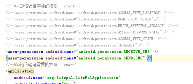 (2)在as项目中的AndroidManifest.xml文件中添加图3所需权限,由于SMS权限为危险权限,所以还要动态申请,这在下面代码中会有体现。注意权限是写在application外面,不是里面。