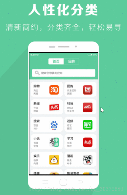从上面效果看出,只是在引导页之间添加了一个动画而已,而Google提供的PageTransformer就可以对当前位置的引导页进行操作,比如:设置透明度的变化,设置缩放的变化,就能实现切换的动画效果