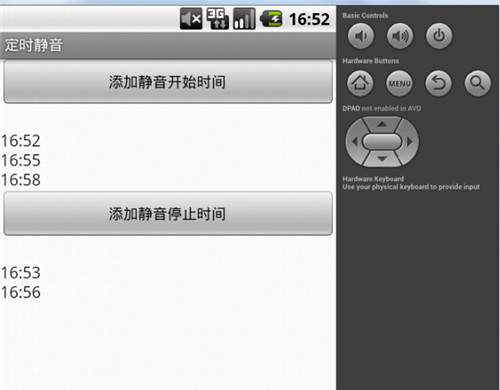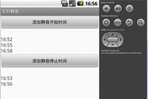 先简单介绍一下工作原理。在添加时间点之后,需要将所添加的时间点保存在文件或者数据库中,我使用了SharedPrefences来保存时间点,key和value都是时间点,然后用到AlarmManager每隔一分钟扫描一次,在扫描过程中从文件获取当前时间(时:分)的value,如果成功获得value就说明当前时间为时间点,此时调用audioManager ,当扫描掉button1设置的文件信息,就调用AudioManager.RINGER_MODE_SILENT,如果扫描到button2设置的文件信息,就调用AudioManager.RINGER_MODE_NORMAL,时期出去正常模式。